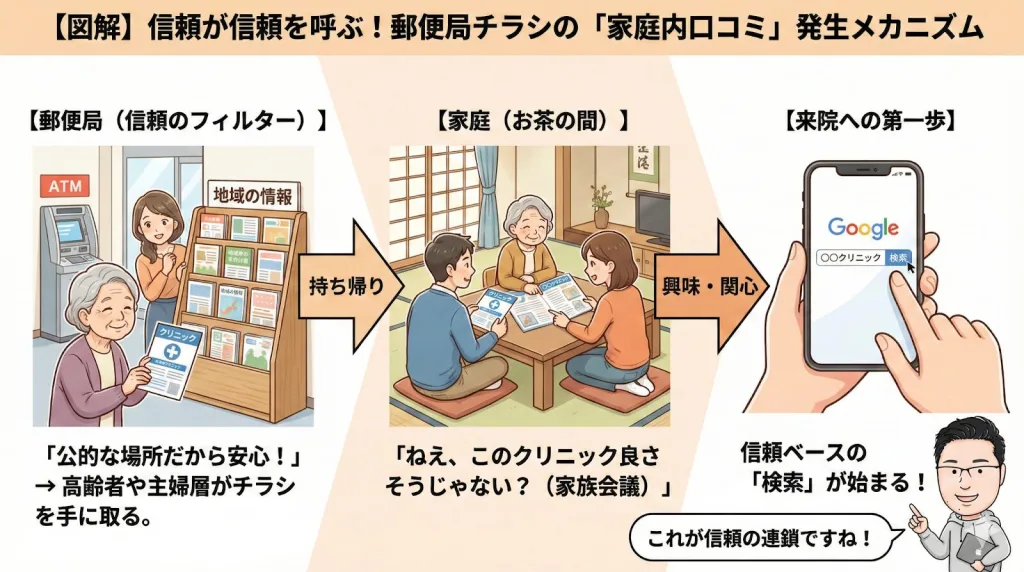 郵便局は地域住民が日常的に訪れ、かつ非常に高い公的信頼を寄せている場所ですよね。この「信頼感」を味方につけることが、集患においてどれほど有利に働くか、想像してみてください。