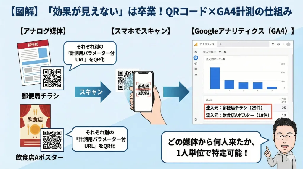 チラシに印刷するQRコードに、計測用の専用URLを仕込んでおくんです。そうすれば、Googleアナリティクス(GA4)上で『郵便局のチラシ経由で何人がアクセスしたか』が1人単位で分かります。これにより、アナログな施策も『やった効果があったね!』とデータで証明できるんです。