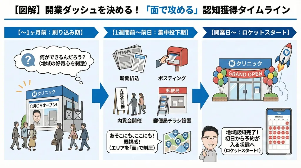 そして開業1週間前。ここで新聞折り込みチラシやポスティング、そして内覧会の告知を集中投下します。さらに郵便局へのチラシ設置もこのタイミングで開始します。