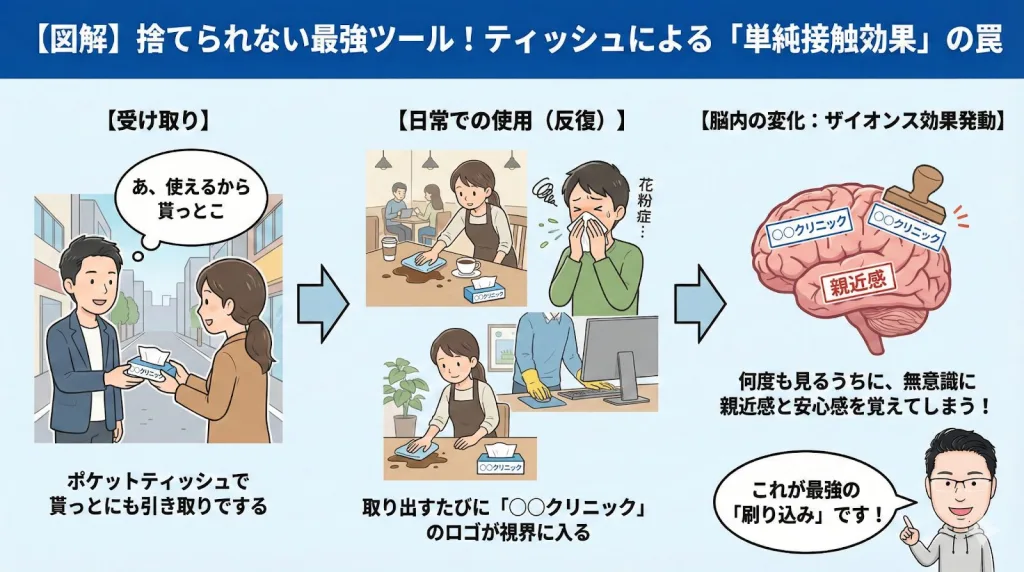 さらに手軽で即効性のある施策として、ポケットティッシュの配布と薬局への協力依頼があります。ティッシュは実用品であり、拒否されることがほとんどありません。