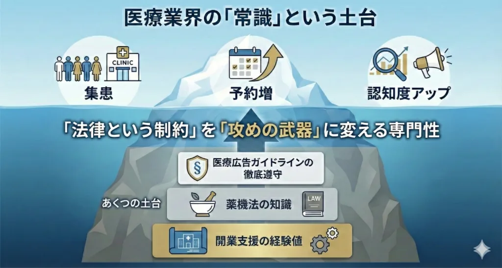後になって気づいたのですが、この「医療の常識」を完璧に理解した上で、かつ「集患(患者さんを呼ぶ)」という結果も出せる人間は、世の中に驚くほど少ないのです。