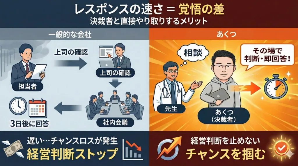 しかし、私は自分の仕事に全責任を負っている決裁者です。だからこそ、その場で「この金額でやりましょう」「ここはサービスします」と即断即決できます。