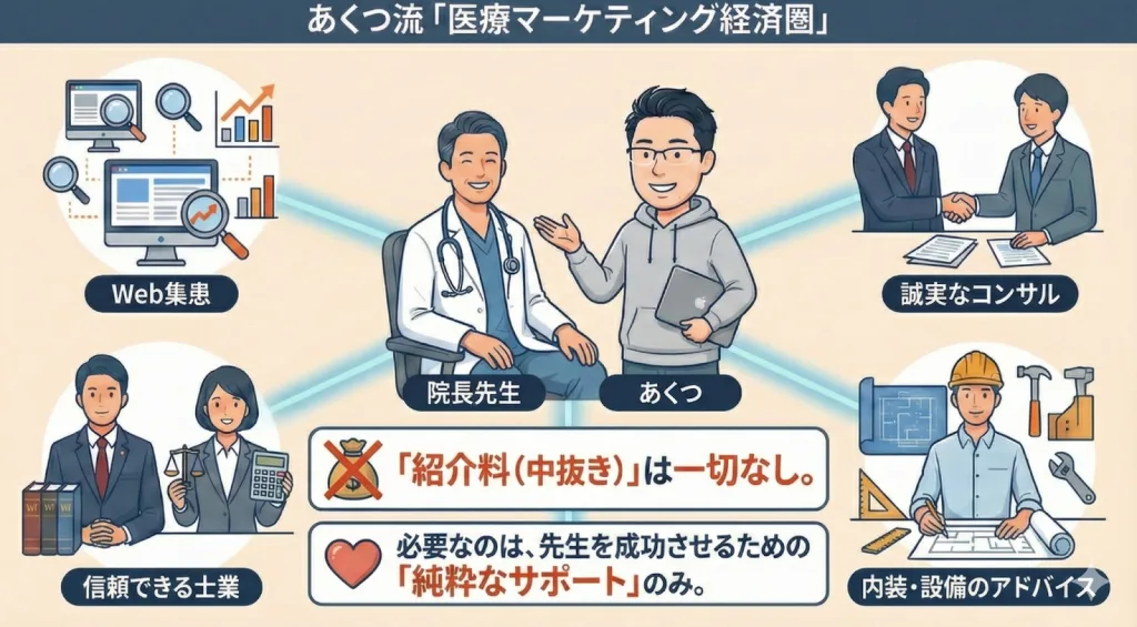 税理士の選定、内装のトラブル、ぼったくらない誠実な医療コンサルの紹介まで、私は先生が抱えるあらゆる課題に対応できる「経済圏」を築いています。