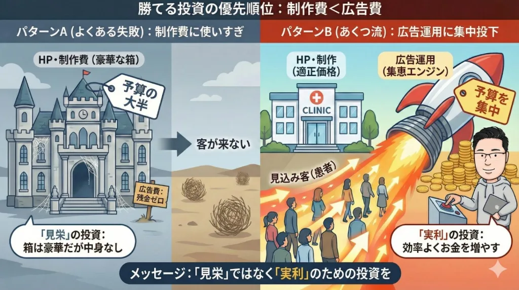 ホームページ制作やLINEの構築費用をあえて安く設定しているのは、その分の予算を「集患に直結する広告費」に充ててほしいと考えているからです。