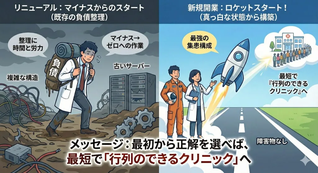 一方で新規開業は、真っさらな状態から最強の構成を組むことができます。最初から私を信じて任せていただける案件の方が、圧倒的に高いパフォーマンス、つまり「行列のできるクリニック」を作りやすいのです。
