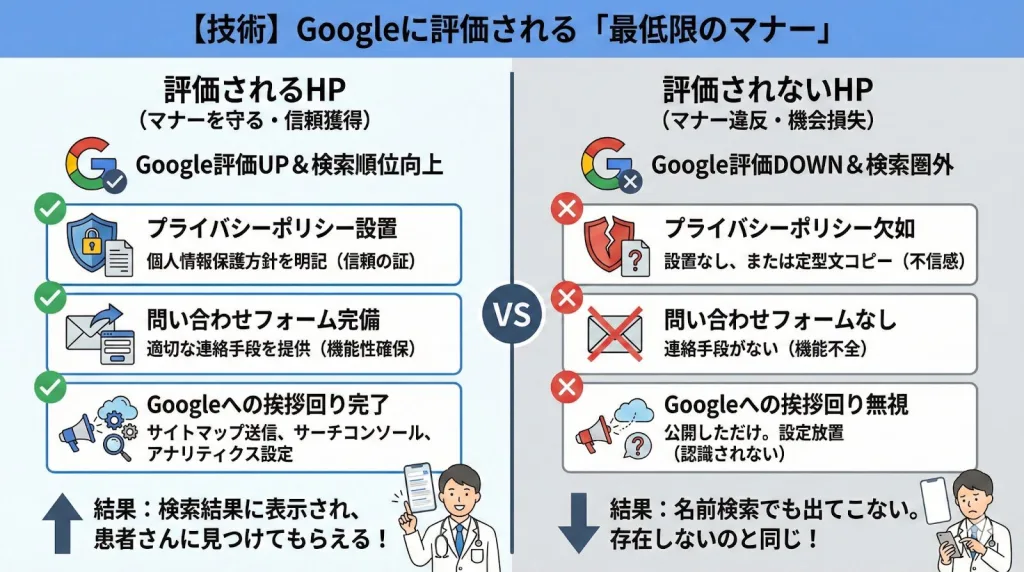 医療という極めて機密性の高い個人情報を扱う以上、『この情報は適切に管理します』と明記されたポリシーを設置することは、Googleに対して『このサイトは信頼に値する、ちゃんとしたサイトだね』と認識させるための最低限のマナーなんです。