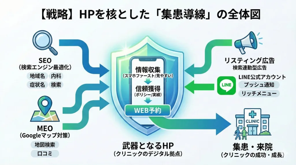 リスティング広告、LINE公式、MEO(Googleマップ対策)、SEO。これらをどう組み合わせて、最終的にHPの予約ボタンまで誘導するのか。
