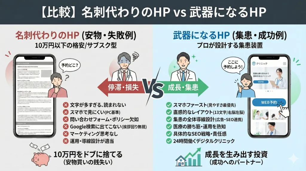 10万円という目先の安さに釣られて、戦えない武器を買わないでください。先生の素晴らしい医療スキルを、正しく地域の方に届けるための投資を、ぜひ真剣に考えていただきたい。