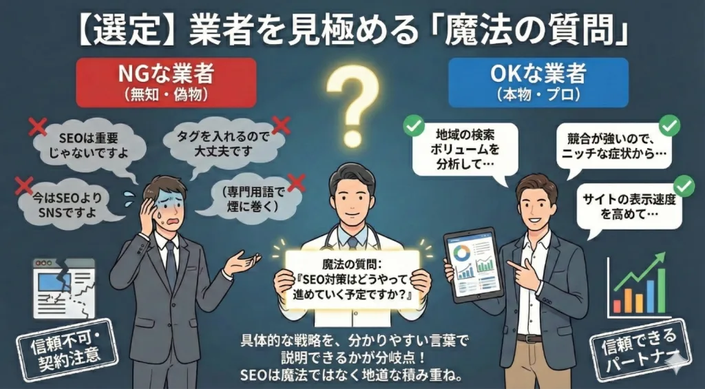 医療広告ガイドラインへの理解はもちろんですが、他院で「どのページが一番見られ、どの表現が予約に繋がったか」という具体的な実績を持っているかを確認してください。
