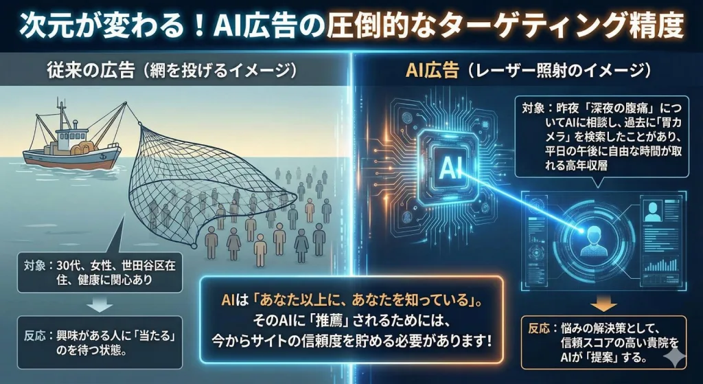 AIが個人の状況を完璧に把握していれば、広告主であるクリニック側にとっても、来院率がこれまでにない精度で向上する可能性があります。