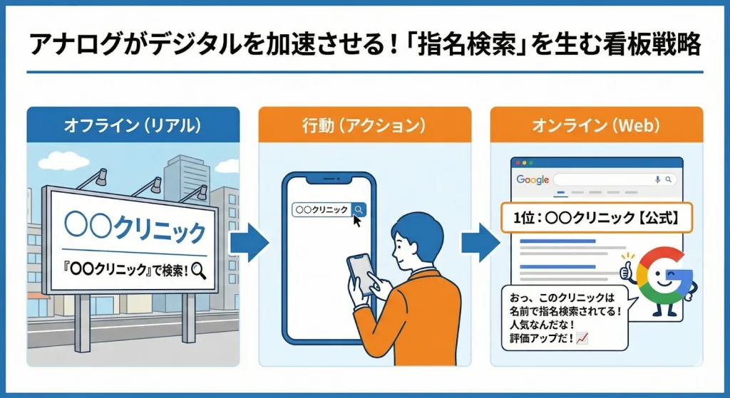 看板にクリニック名を大きく出し、「〇〇クリニックで検索」という導線を作る。これによって、地域の方々が特定の名前で検索する指名検索が発生します。
