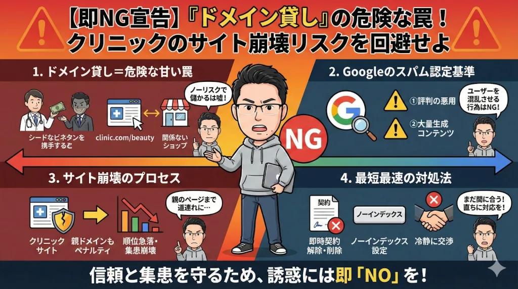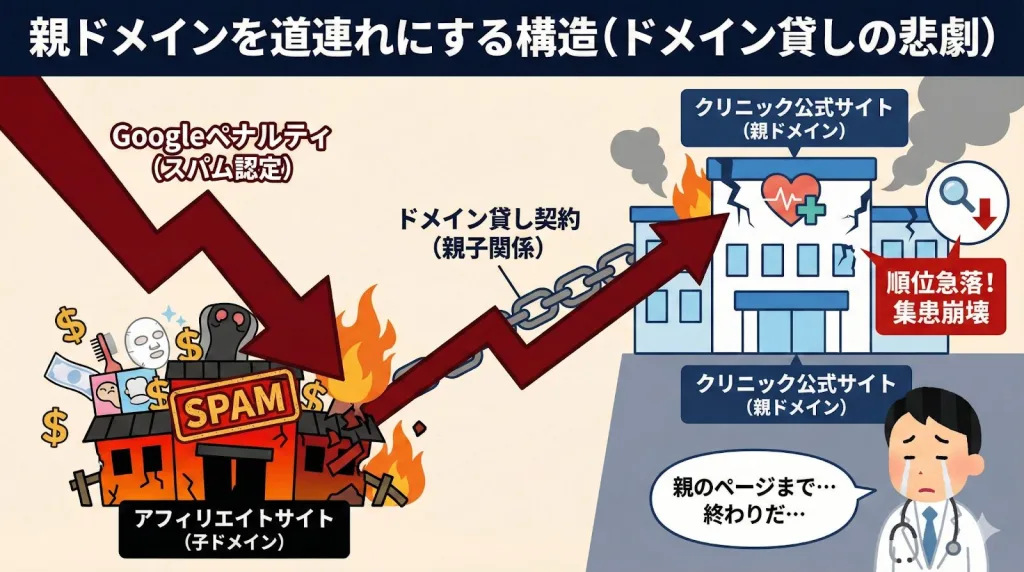ドメイン貸しは、ウェブサイトにとって「親のページですら下げられる」という致命的なリスクを伴います。