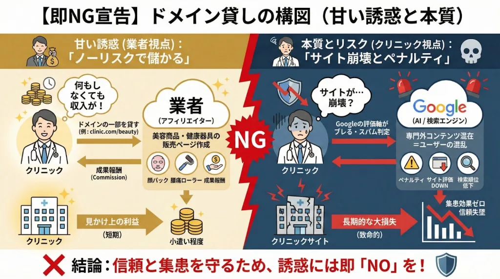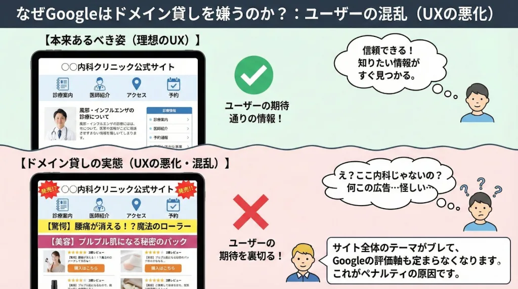 クリニックの強いドメインの評判を、無関係な業者が悪用し、ユーザーを混乱させるドメイン貸しは、その理念に真っ向から反するため、ペナルティの対象となるのです。