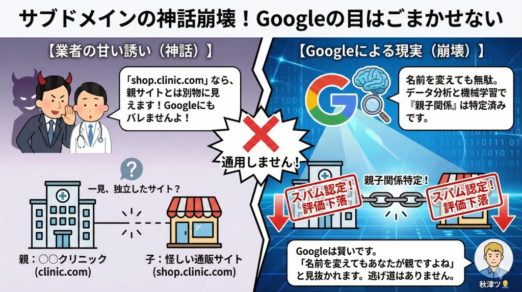 - 一見独立したサイトに見えますが、Googleは膨大なデータと機械学習によって、この「名前を変えた親子の関係」を正確に把握しています。