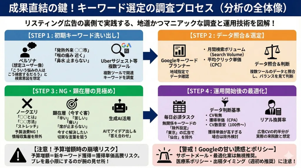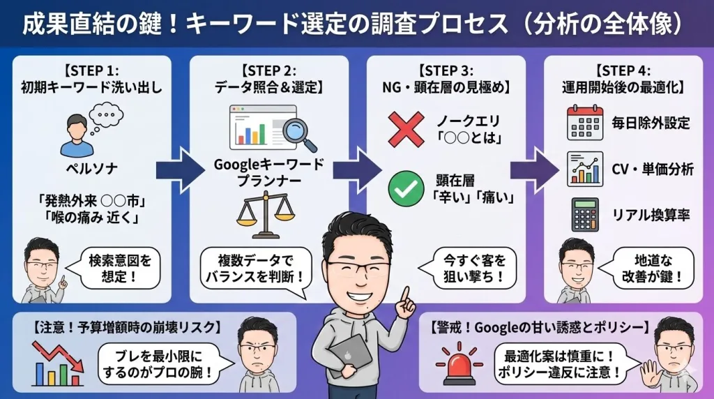 キーワード選定においては、一般的なポリシーに加え、医療広告ガイドラインやGoogle独自の医療系ポリシーに準拠する必要があります。