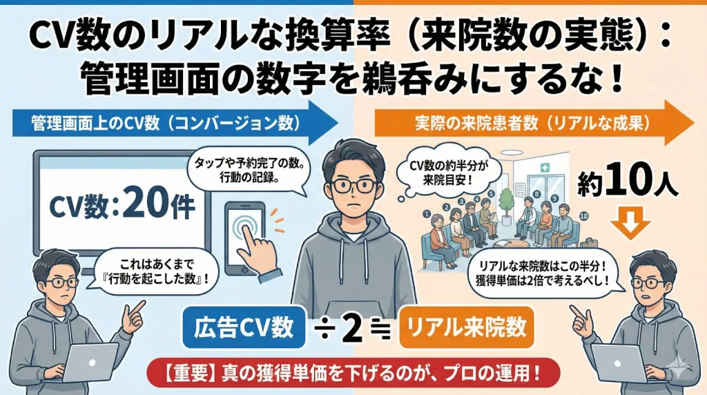 LINE予約や電話ボタンのタップをCVとして設定した場合、このCV数は「クリックして行動を起こした数」であって、「実際にクリニックに来た数」ではありません。