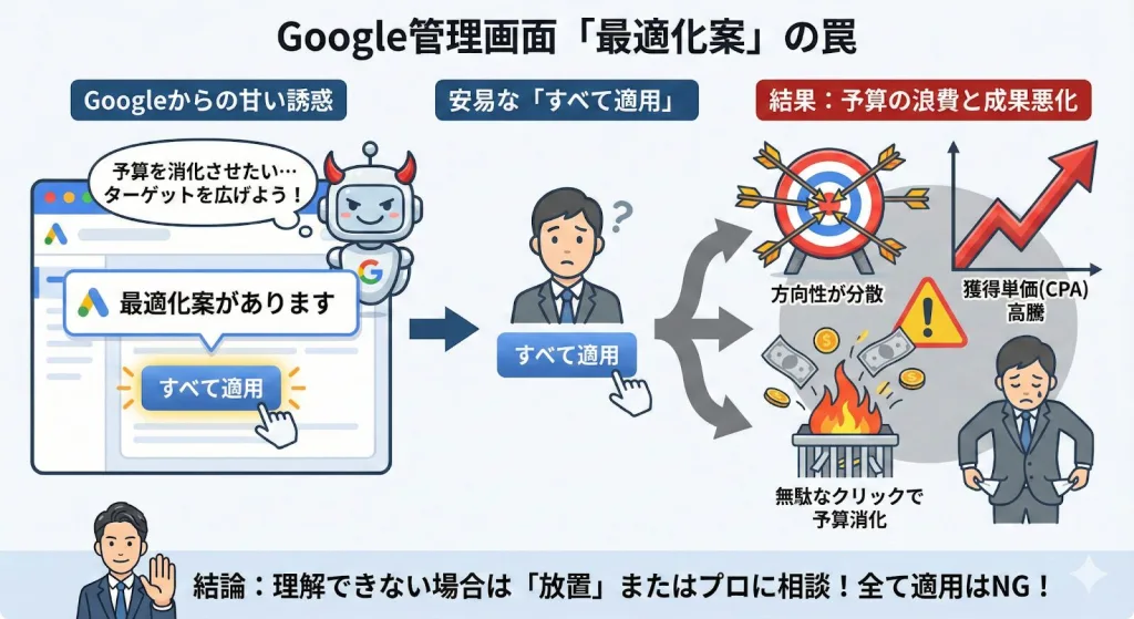 運用を続けていると、Google側から「無料相談」のメールや、管理画面に「最適化案」が出てくることがあります。これらには要注意です。