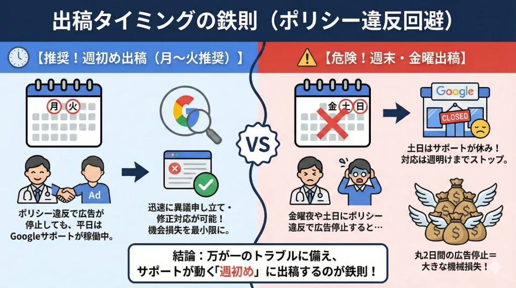 広告を出稿する時は金曜日にやらない方がいいですね。意義申し立てできるんですけど、それが土曜日とかの夜だと、申し立て先が土日休みなんで、土日広告出せないんですよ。