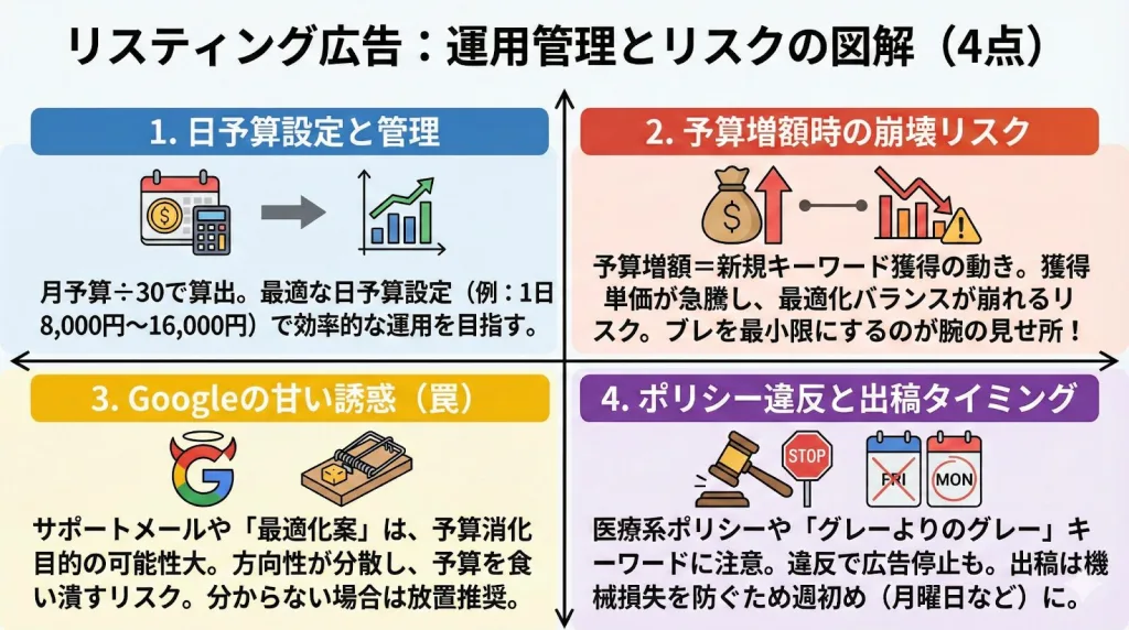 運用側の効率性から言えば、「月予算÷30」で日予算を算出し、1日8,000円から16,000円程度で設定できるのが望ましいです。