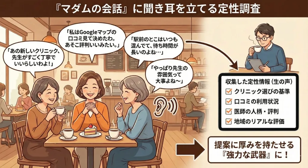 地域住民が、「どういう基準でクリニックを選んでいるのか」、「Googleマップの口コミを見ているのか」、「先生の性格的なものを重視しているのか」など、ウェブ上のデータだけでは得られない定性的な情報(生の声)を集めます。