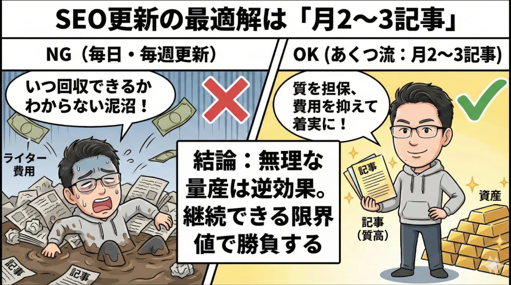 更新性は一つの指標ですが、無理な量産は逆効果です。費用対効果(ROI)が合いません。