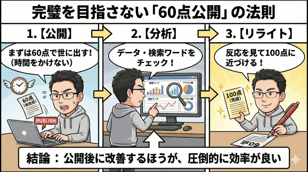 私はまず、60点の出来で世に出すことを優先します。公開した後、実際のユーザーの反応や検索ワードを分析し、それから100点に近づけていくリライトを行うほうが、圧倒的に効率が良いのです。