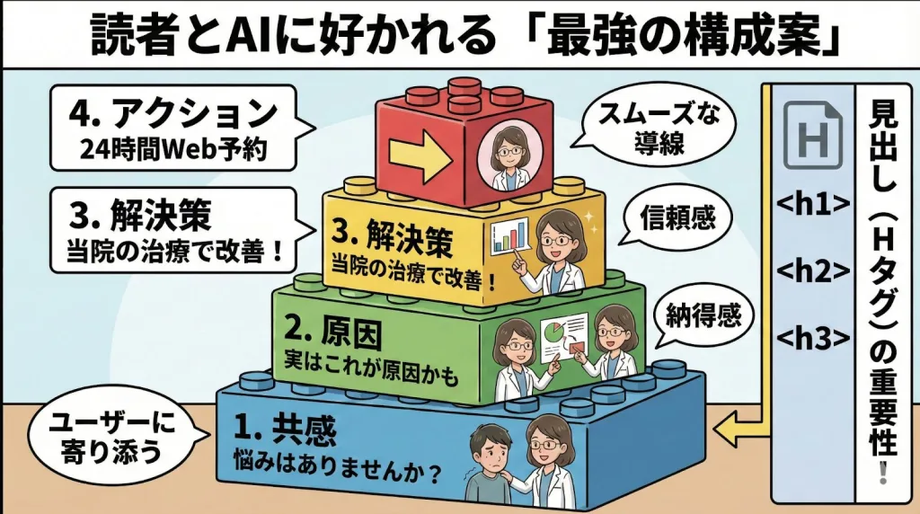 この流れは医療広告ガイドラインを守りつつ、患者さんの行動を促すための最強のフレームワークです。
