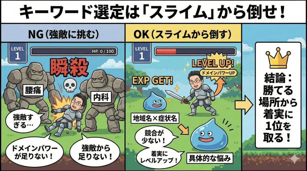 クリニックのサイトがレベル1の勇者だとしたら、いきなり「腰痛」や「内科」といったビッグキーワード(強敵)に挑んでも瞬殺されます。