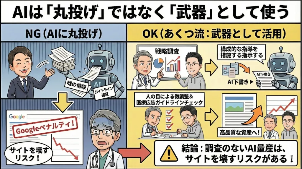 私は、AIに下書きをさせた後、必ず人の目で微調整を行い、何より医療広告ガイドラインに抵触していないか、専門家として不適切な表現がないかを徹底的にチェックして仕上げます。