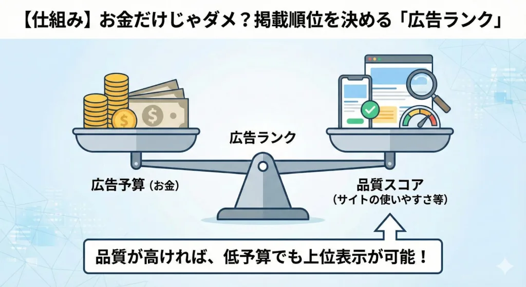 リスティング広告の掲載順位を決めるのは、主に「広告予算」「品質スコア」「表示オプション」の3要素から成る「広告ランク」です。これを一言で表現するなら「広告のクオリティ」です。