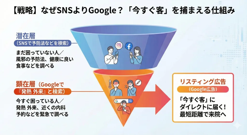 - この層は「今朝から熱がある」「喉が痛くて我慢できない」という緊急事態にあります。彼らが取る行動は、Instagramでおしゃれな投稿を探すことではなく、Googleで「発熱 外来」「近くの内科 予約」と検索することです。