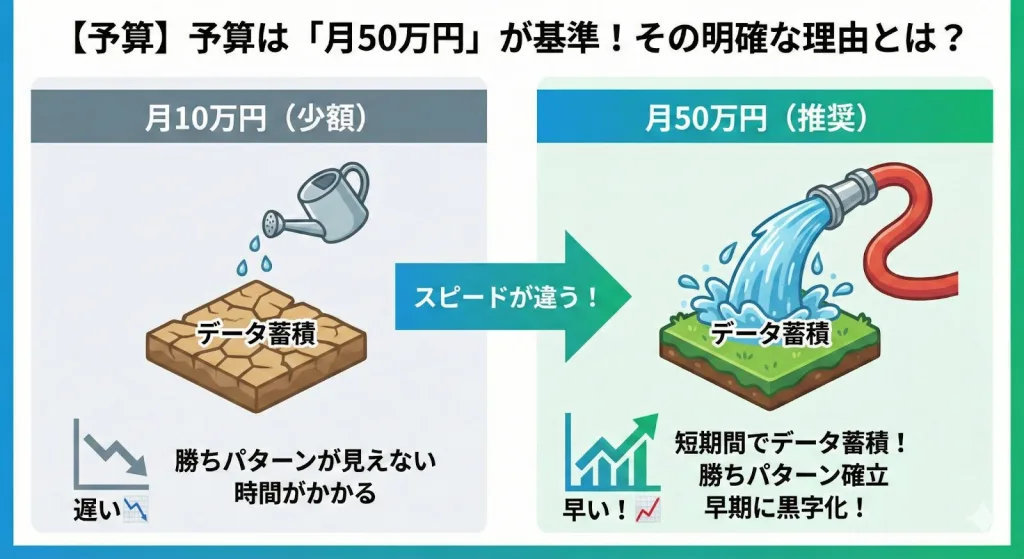 月10万円でちびちびと数ヶ月かけてデータを集めるよりも、50万円を投下して短期間で「どのキーワードが勝ち、どのキーワードが負けか」を確定させるほうが、結果的にトータルの広告費を抑えることができます。