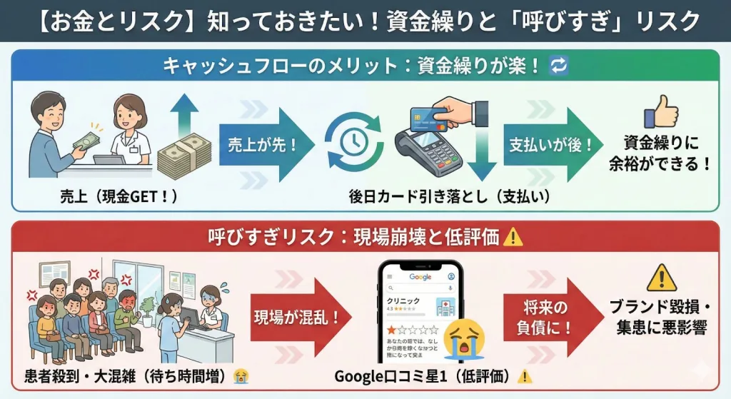 しかし、リスティング広告は基本的にクレジットカード決済です。広告を通じて来院した患者さんが窓口で現金を支払えば、その売上は即座に手元に入ります。